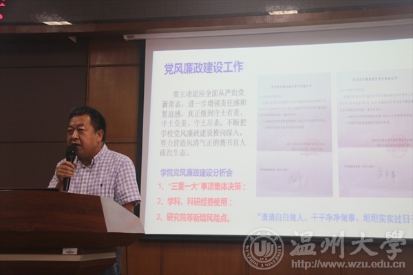 会上方乐平书记就党风廉政建设进行分析,方乐平就学院党风廉政建设在“三重一大”事项集体决策、学科和科研经费的使用、研究院等新增风险点等方面的重要性进行了说明,要求全院党员同志树立自律意识,严格把控,为学院党风廉政建设添砖加瓦。